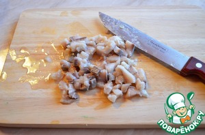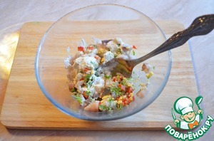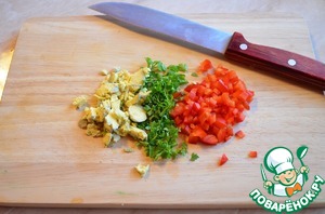 Мелко порубить зелень, порезать маленькими кубиками красный сладкий перец, порубить желток вареного яйца.