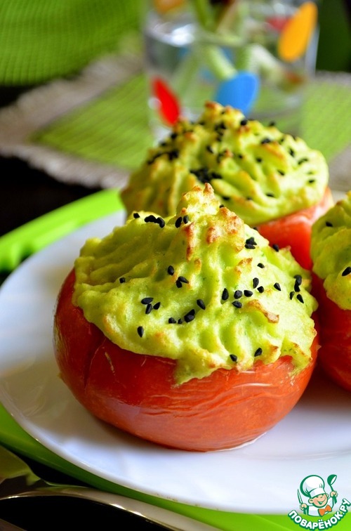 Выложить на помидоры картофельное пюре. Посыпать черным кунжутом и запекать в разогретой духовке до 180 градусов 30 минут.
