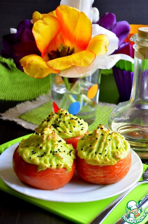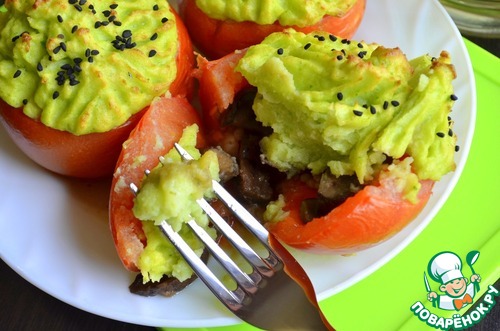 Рецепт «Запеченный помидор с грибами под картофельной шапкой»: