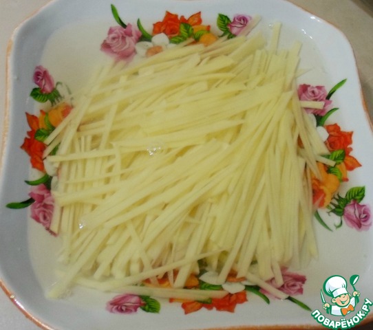 Поместить картофель в глубокую емкость, залить водой, добавить уксус (1 столовую ложку). Оставить на 11 часов мариноваться.