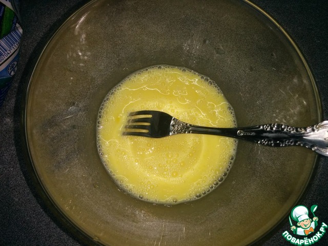 Разбить яйца и смешать с молоком, добавить щепотку соли и все взбить вилкой. Смесь для яичных блинчиков готова.