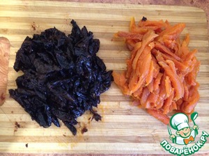 Курагу и чернослив режем соломкой. Чернослив я беру с косточкой, косточку удаляю, а "мякоть" нарезаю соломкой.