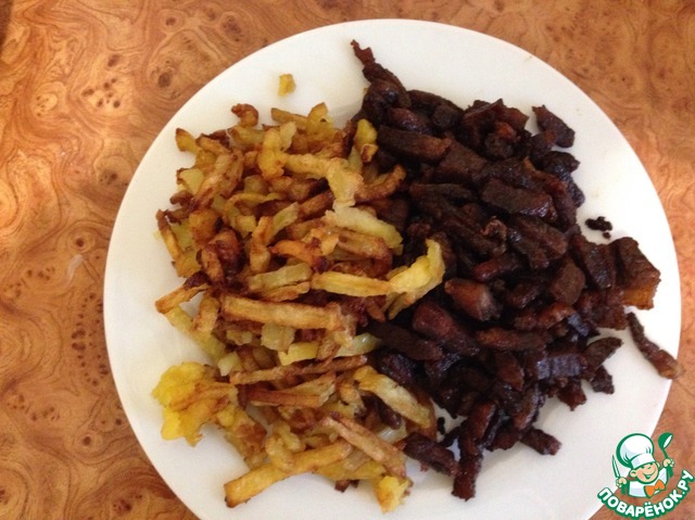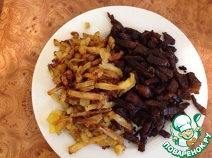 Эту заготовку я тоже делаю заранее, за 2-3 дня и храню в морозилке. Картофель чистим, нарезаем соломкой и обжариваем во фритюре. Выкладываем на салфетку, чтобы удалить лишнее масло. Мясо говядины режем соломкой и обжариваем в масле до готовности. И затем обсушиваем на салфетке.