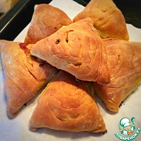 Противень застилаем пекарной бумагой и выкладываем пирожки (треугольники )швом вниз