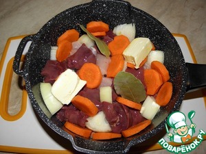 Печень, грудку, лук нарезать произвольно, морковь кружками. сложить в кастрюлю, добавить лавровый лист, перец горошком, посолить по вкусу. добавить все сливочное масло, и поставить тушить на средний огонь минут 30-35минут. ( мясо и овощи дадут много сока)