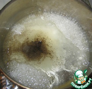 Для маринада все ингредиенты, кроме уксуса, смешать, довести до кипения. Снять с огня, добавить уксус.