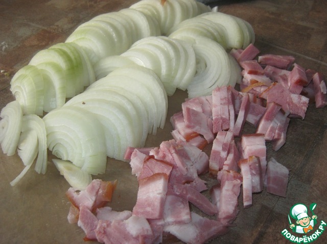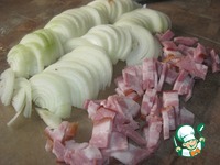 Нарезала оставшиеся 3 луковицы полукольцами и бекон кусочками (будет гарнир)-его мы зажарим! |