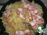 Пассивируем лук до золотого цвета, добавляем бекон и держим на огне ещё минут 5 |