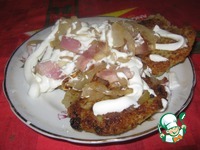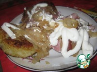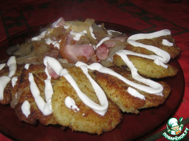 И соединяем наши дыруны с заправкой из лука с беконом... и всё это поливаем сметаной!! |