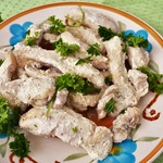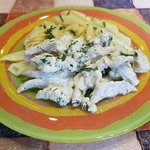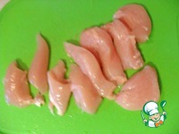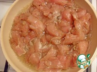Нарезанное филе складываем в емкость (у меня пластиковый контейнер), заливаем маринадом, хорошо перемешиваем и ставим в холодильник минимум на 2 часа. |