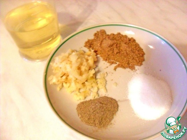 Готовим маринад: смешиваем растительное масло, соль, перец, кориандр, давленый чеснок. |