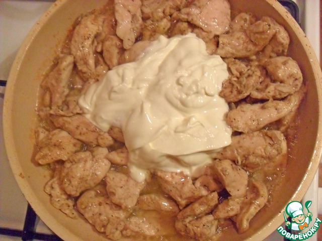 Добавляем сметану, перемешиваем и тушим под крышкой 30 минут. |