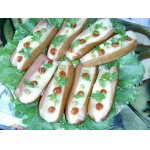 Сосиски очистить от плёнки, нарезать пополам по длине.