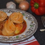 Ну что, пришла пора очередного объединения. Убавляем огонь, аккуратно укладываем наши рулетики на мясо в казанок, добавляем специи, заливаем водой так, чтоб ничего не торчало, закрываем крышкой и забываем на 15 минут.