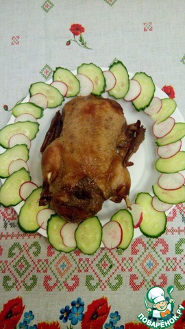 Ставим в разогретую духовку. Запекаем на средней полке при температуре 160-180 градусов. Запекаем утку в духовке 2-2,5 часа до румяного цвета. Выключаем духовку и оставляем утку остывать в духовке. В теплом или слегка горячем виде подаем утку к столу.