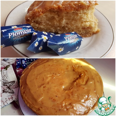 Кекс готов, теперь нам нужно приготовить помадку для смазывания верха. Растапливаем 5 конфет, потихоньку добавляя к ним сгущенное молоко. Готовой помадкой смазываем кекс, ждем полного его остывания и наслаждаемся. Вкусно и с молоком, и с чаем!