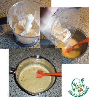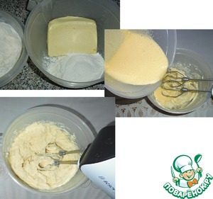 Часть муки (ложки 3-4 столовых), перемешиваем с размягченным сливочным маслом. Я взбила миксером. Затем добавляем желтковую смесь и перемешиваем до однородности.