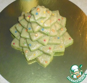 Приступаем к сборке. Для этого, самый первый коржик, кладем на тарелку или специальную подложку, слегка смазанную сгущенкой (это для того чтоб готовый торт не «бегал»). Далее тот же принцип, на каждый коржик капнем сгущенку, а сверху кладем новый. Коржи переносите аккуратно, на лопаточке, во избежание поломки. Таким образом собираем ёлку целиком, смещая иголочки.