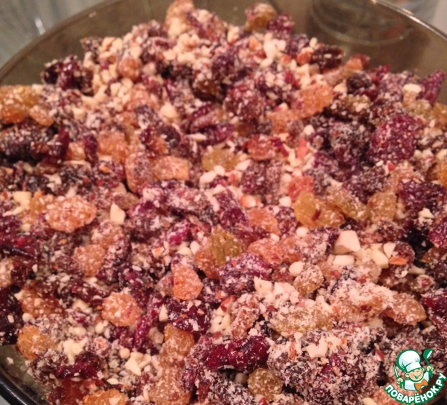- Орехи (Я брал лесной орех (или фундук) и миндаль (по 60 гр.). Кстати, это и есть "изюминка" (да, несмотря на то, что в рецепте изюм имеется и так :) На самом деле, в традиционную рецептуру орехи никогда не входили, но они придают блюду некоторую текстуру, запах; да и вообще какое-то новогоднее настроение.) — 120 г