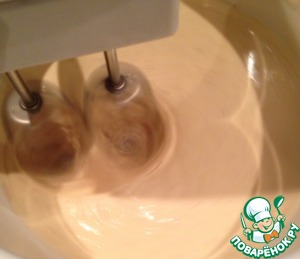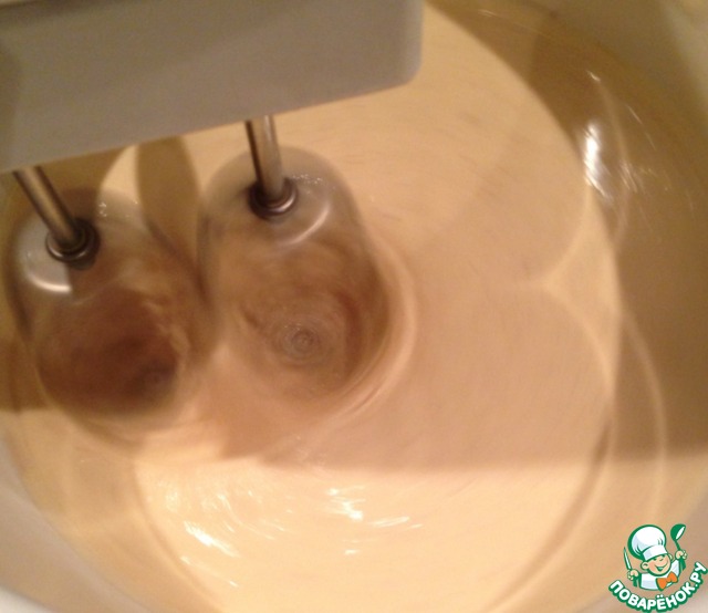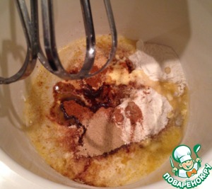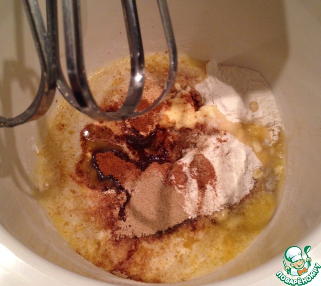 Взбили все? Останавливаем все "взбивалки" и смешиваем одно с другим (масса из яиц, сахара и меда + масса из муки, масла и пряностей) и снова запускам взбиваться; еще минут пять (кстати, пора включать разогреваться духовку, в которой будет происходить главное действо; пока только разогреваем; я всегда ставлю сразу на 200 градусов, а за минуту до подачи убавляю жар до нужной температуры; об этом далее). В конце процесса взбивания, конечно, добавляем оставшуюся муку (50 гр.) и взбиваем еще все вместе, в последний раз, еще минуты две.