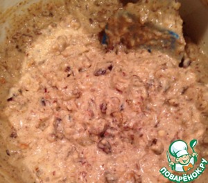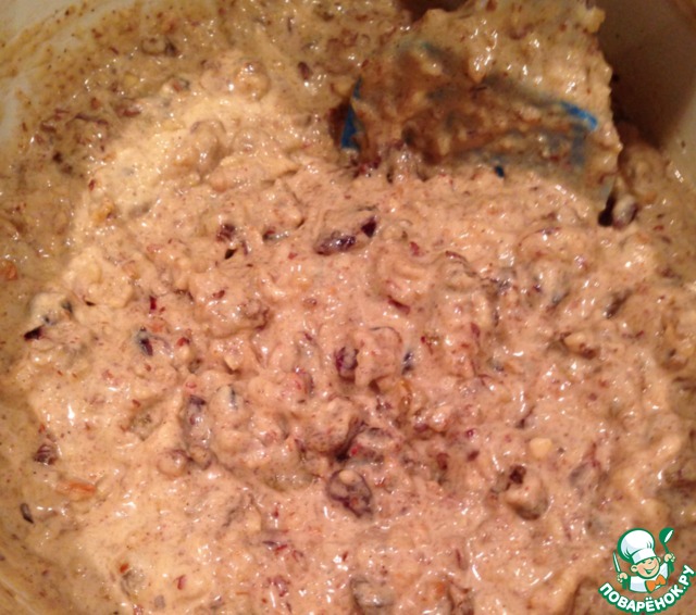 Теперь самое-самое перед запеканием нашего пудинга. Смешиваем полученную массу (которую мы старательно делали последние несколько минут) и наши сухофрукты-орехи, которые настаивались два часа.