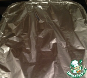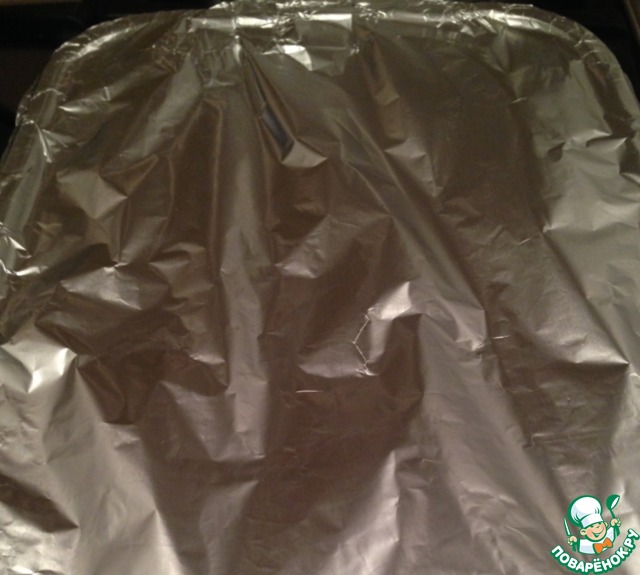 В общем, выкладываем наш будущий пудинг в форму и закрываем все это фольгой. Кстати, не забываем убавить температуру в духовке до ~ 140 градусов. Убавили? Ну всё, отправляйте пудинг внутрь! Теперь осталось подождать некоторое время (пока ждете привлечете, наверное, всех родных, близких, друзей, соседей и так далее - всех, кто будет рядом, на кухню; запах будет нереальным).
