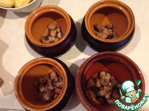 • Режем мясо на кубики, обжариваем на растительном масле и раскладываем по горшочкам
