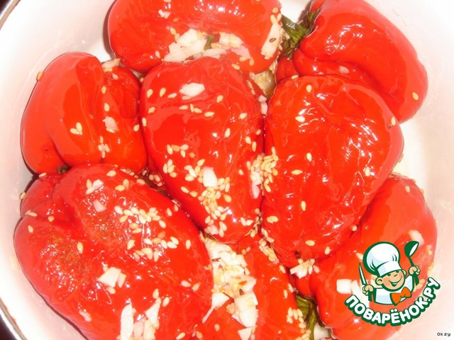 Выложить перцы в емкость в один слой, посолить, поперчить, посыпать кунжутом, сбрызнуть уксусом. Дать настояться при комнатной температуре пару часов. Периодически перемешивать.
