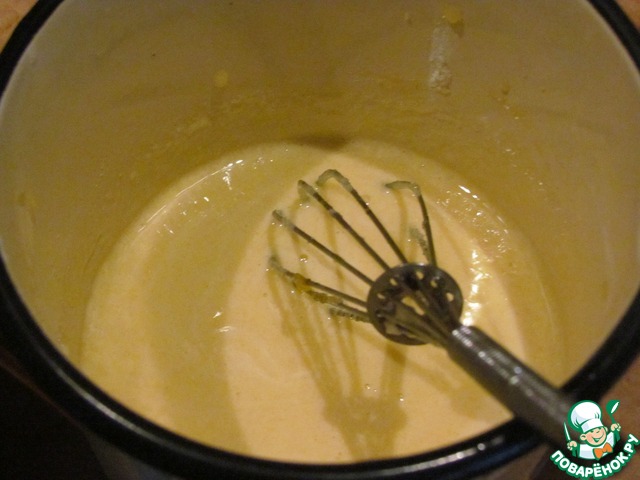 Затем добавить подтаевшее масло и взбить все миксером до однородности и образования пышной массы.