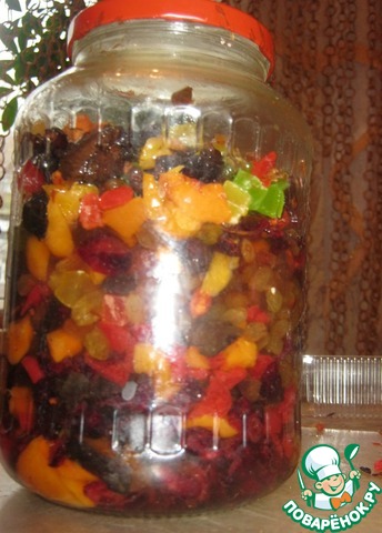 • Засыпала сухофрукты (без орехов) в банку с закручивающейся крышкой и залила коньяком. В такой банке удобно их трусить-переворачива ть-хоть раз в день