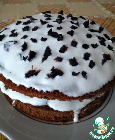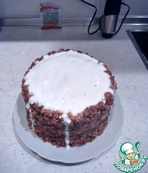 Остатки обрезков теста смешиваем с кремом и заделываем бока торта.
