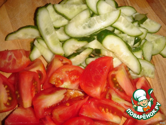 Помидоры порезать на четвертинки, если шерри, то на половинки. Огурцы порезать тонкими полукольцами.