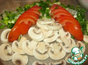 Нарезаем помидоры, шампиньоны, лук, разбиваем яйца, в них -3ст. л сметаны, зелень, размятый сливочный сыр, соль