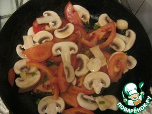 На раскалённую сковородку бросаем шампиньоны и помидоры, жарим минуты три