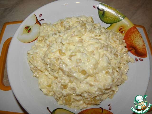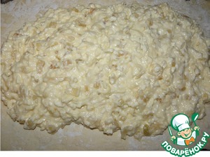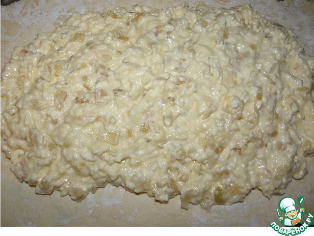 К сыру добавить жаренный лук и яичную смесь, специи по вкусу, все хорошо перемешать. Начинка не должна быть жидкой.