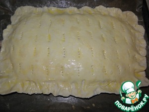 Накрыть второй половиной теста, и защипать края. ( извиняюсь.., у меня не очень красиво.., детки лепили..) Затем в верху сделать проколы вилкой ( желток чуть разбавить водой), и смазать им верх. посыпать кунжутом