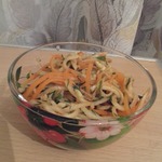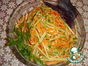 Редьку нашинковать также на терке для корейских салатов, только если есть разные насадки, то редьку лучше нашинковать толще, чем морковь.