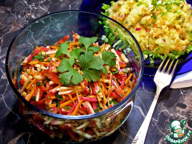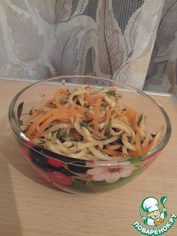 Слегка островатый салат из редьки для ценителей корейской кухни.
