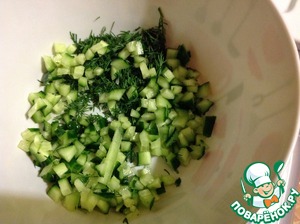 • Нашинковать мелко укроп и огурец порезать мелким кубиком