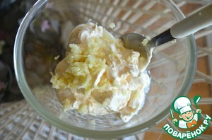 3. Смешать майонез с пропущенным через пресс чесноком и намазать получившейся смесью рыбу.