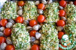 2. Смазать противень оливковым маслом. Выложить на противень кусочки филе, в промежутки положить помидоры черри, и моллюски.