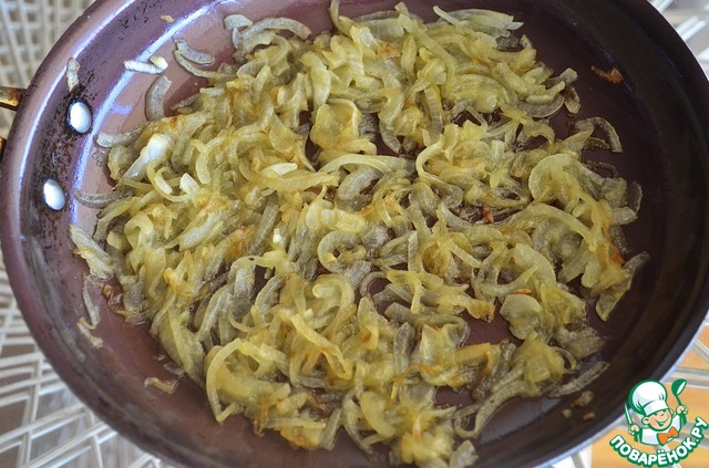 3. Вторую луковицу порезать четверть-кольцами и тушить в оливковом масле на медленном огне 40 минут, чтобы лук стал совсем мягким и почти растворялся в масле. Масла должно быть достаточно, чтобы лук не пересыхал.