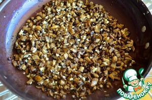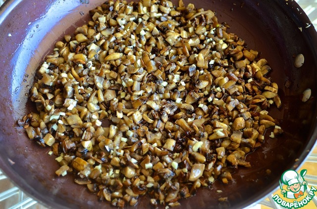 4. Грибы порезать небольшими кубиками и обжарить в оливковом масле на среднем огне 15 – 20 минут, чтобы они зарумянились, и чтобы вышла жидкость. В конце готовки мелко порезать чеснок и добавить к грибам.