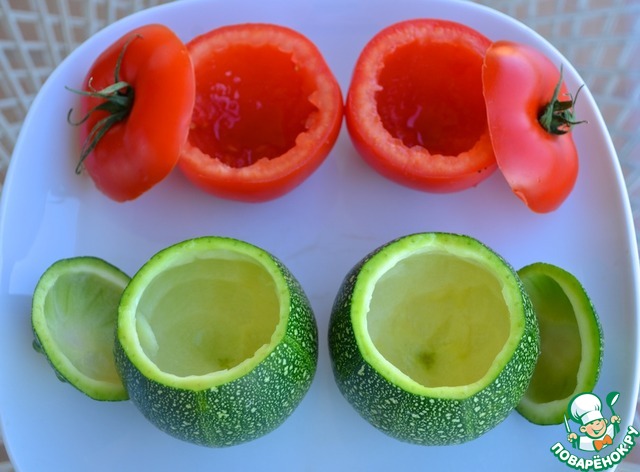 5. Цуккини и помидоры помыть и высушить. Срезать «шляпки» и вынуть мякоть. Мякоть цуккини порубить и потушить в оливковом масле на среднем огне примерно 10 – 15 минут. Мякоть помидора оставить для жюльена из креветок.