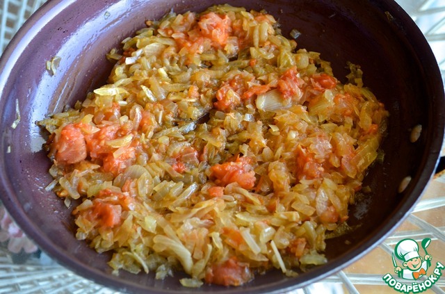 7. Для жюльена из креветок: луковицу порезать мелкими кубиками и обжарить в оливковом масле до прозрачности. Добавить мякоть помидора, посолить, поперчить и готовить на среднем огне 5-7 минут.