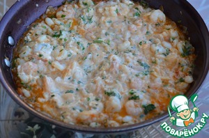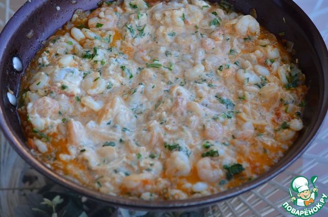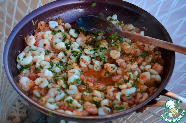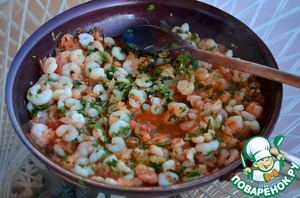 8. Добавить креветки, мелко порезанный чеснок и рубленную петрушку и потушить 2 минуты.