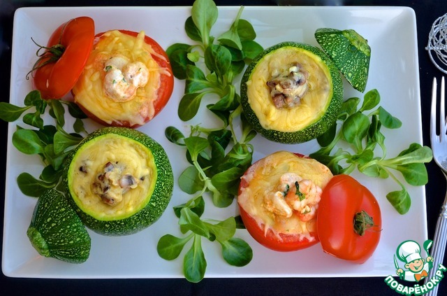 10. Наполнить цуккини жюльеном из грибов и курицы, а помидоры - жюльеном из креветок. Овощи посыпать тертым сыром и запекать в духовке вместе с «шапочками» при температуре 200С 7-8 минут, чтобы сыр расплавился.
