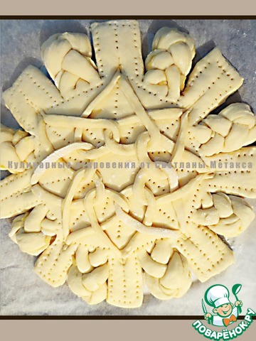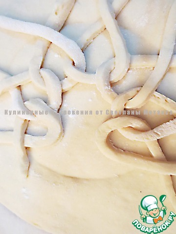 Из третьей части также раскатываем лепешку и вырезаем полоски ( 0,5 мм шириной). Выкладываем полоски на поверхность верхней лепешки в виде петли, накладывая один конец на другой, по порядку пропуская последующую полоску теста через предыдущую петлю.
