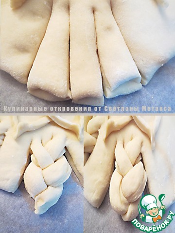 Заплетаем косички из каждой тройки надрезов, оставляя между косичками по одному надрезу. Смотрите на фото, если что-то не понятно написала.