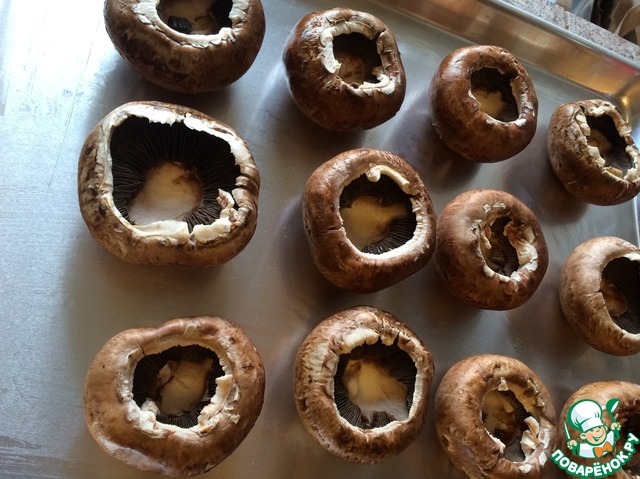 • Ставим разогреваться духовку до 175 C. смазываем противень растительным маслом. Берем грибы, отрезаем у них ножки и выкладываем грибы на противень. Я брала портобелло (похожи на шампиньоны, только крупнее), можно и шампиньоны. Чем крупнее грибы, тем меньше возиться под конец.